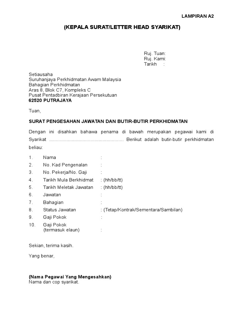 Tuanpuan pengesahan jawatan nama pekerja. Surat pengesahan perkhidmatan.
